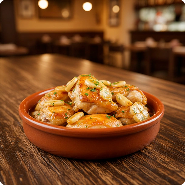 Pollo dorado con ajo, jugoso y con el punto de limón/herbas si procede.